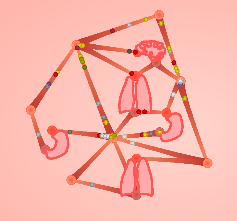 Cells flow through Vessels. Vessels connect Nodes. There are three cell types: Oxygen, Nutritional, and Neural. Lungs rejuvenate Oxygen cells, Stomachs rejuvenate nutrition cells, and Brains rejuvenate neural cells. Kidneys Filter out dead cells.